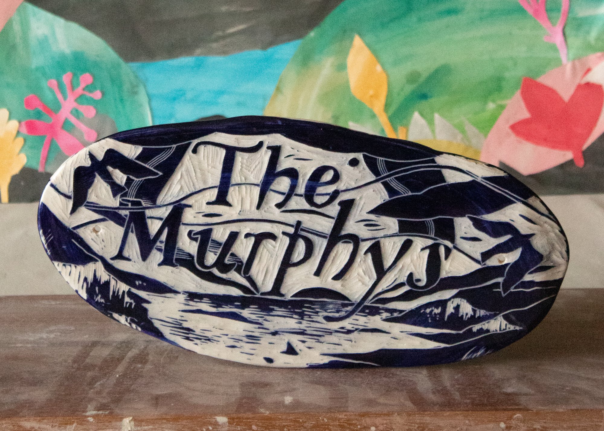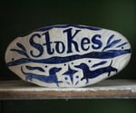 Bespoke hand-carved ceramic sign bearing name of choice with a simple iconograph.