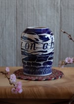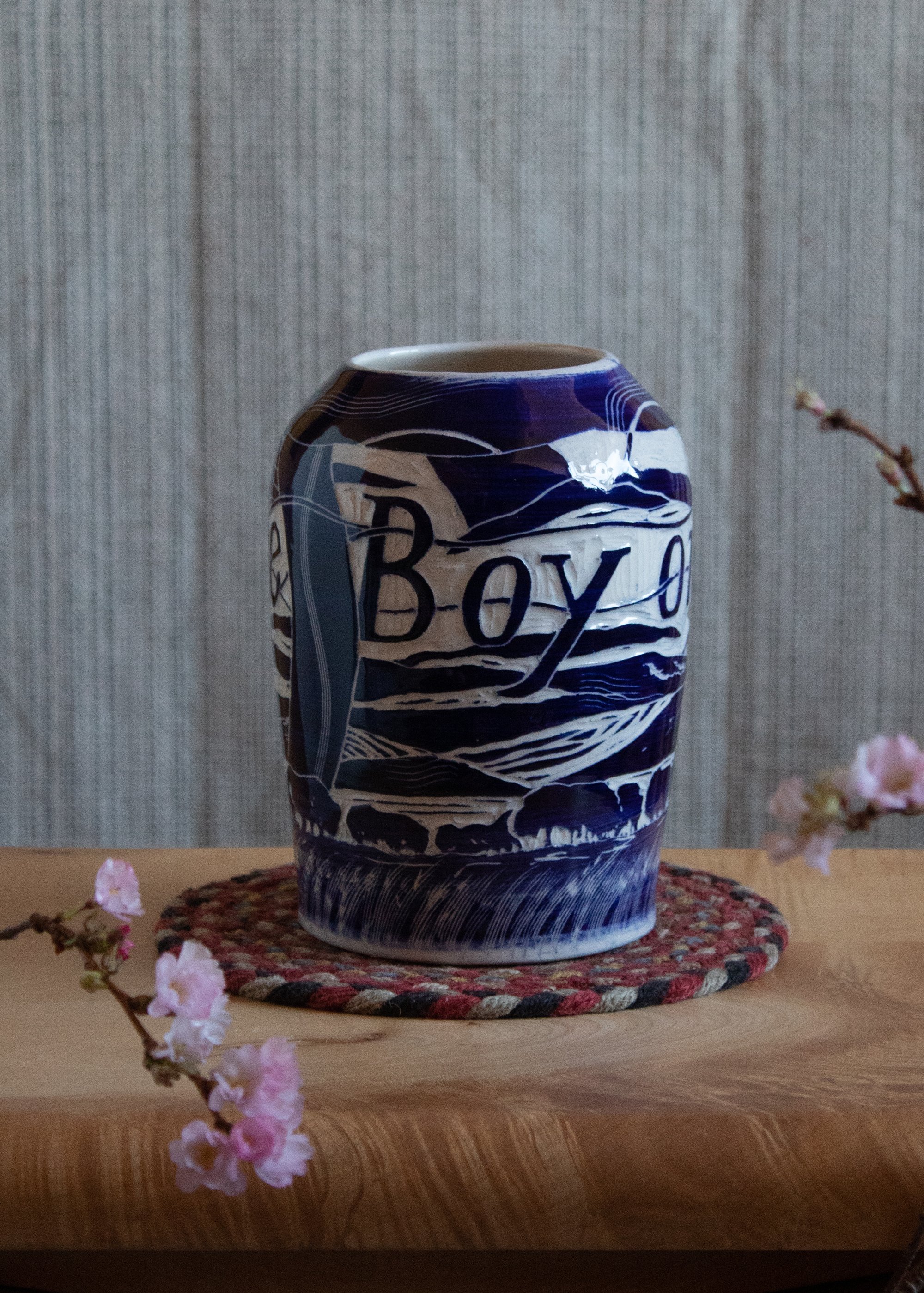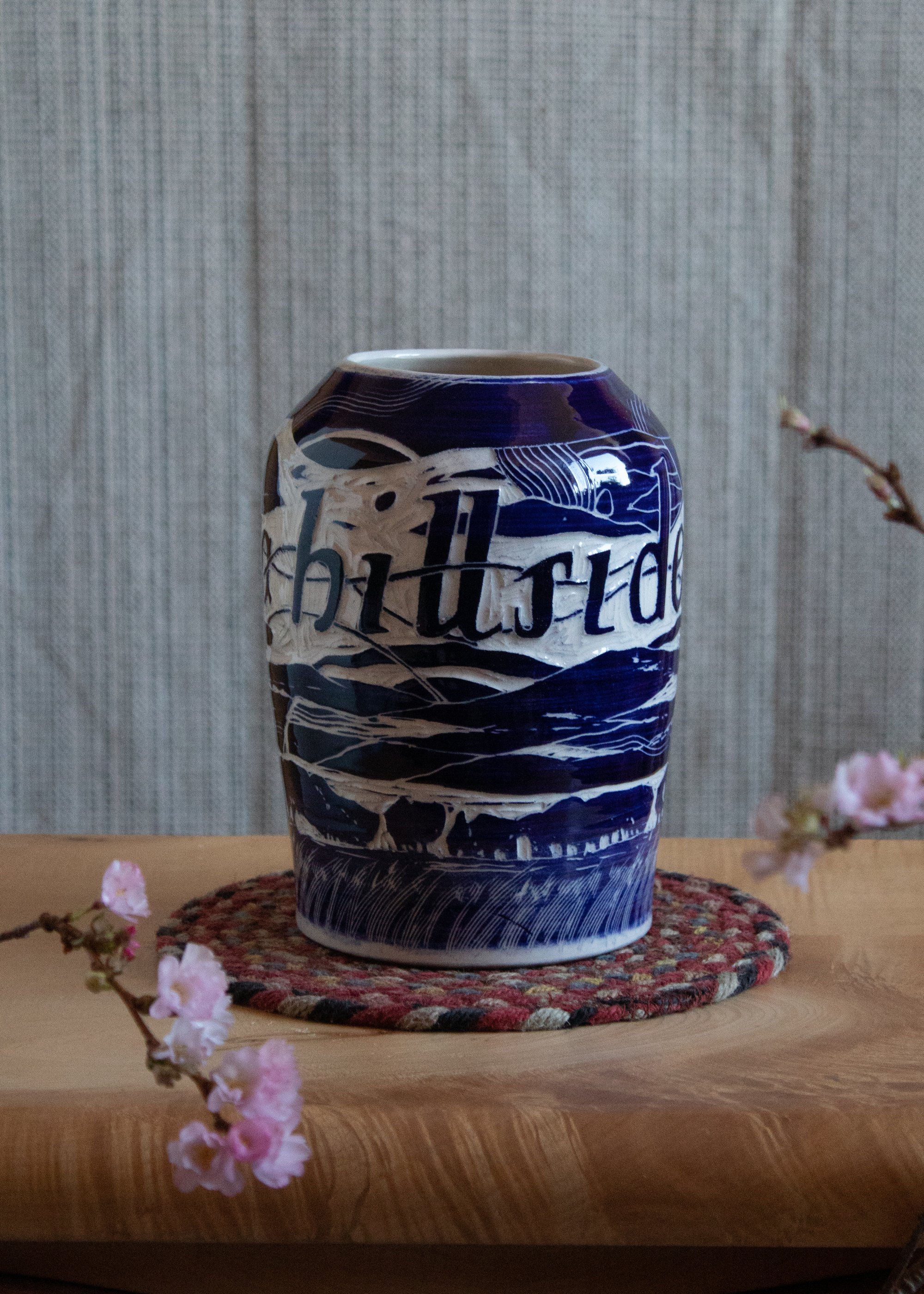 Earthenware Vase, cobalt slip, sgrafitto