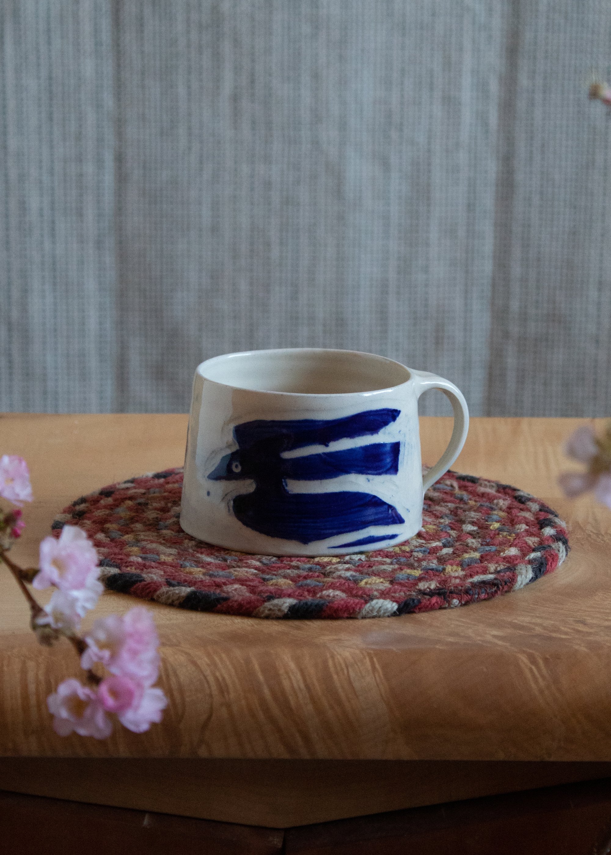 Stoneware mug with hand carved jackdaw motif